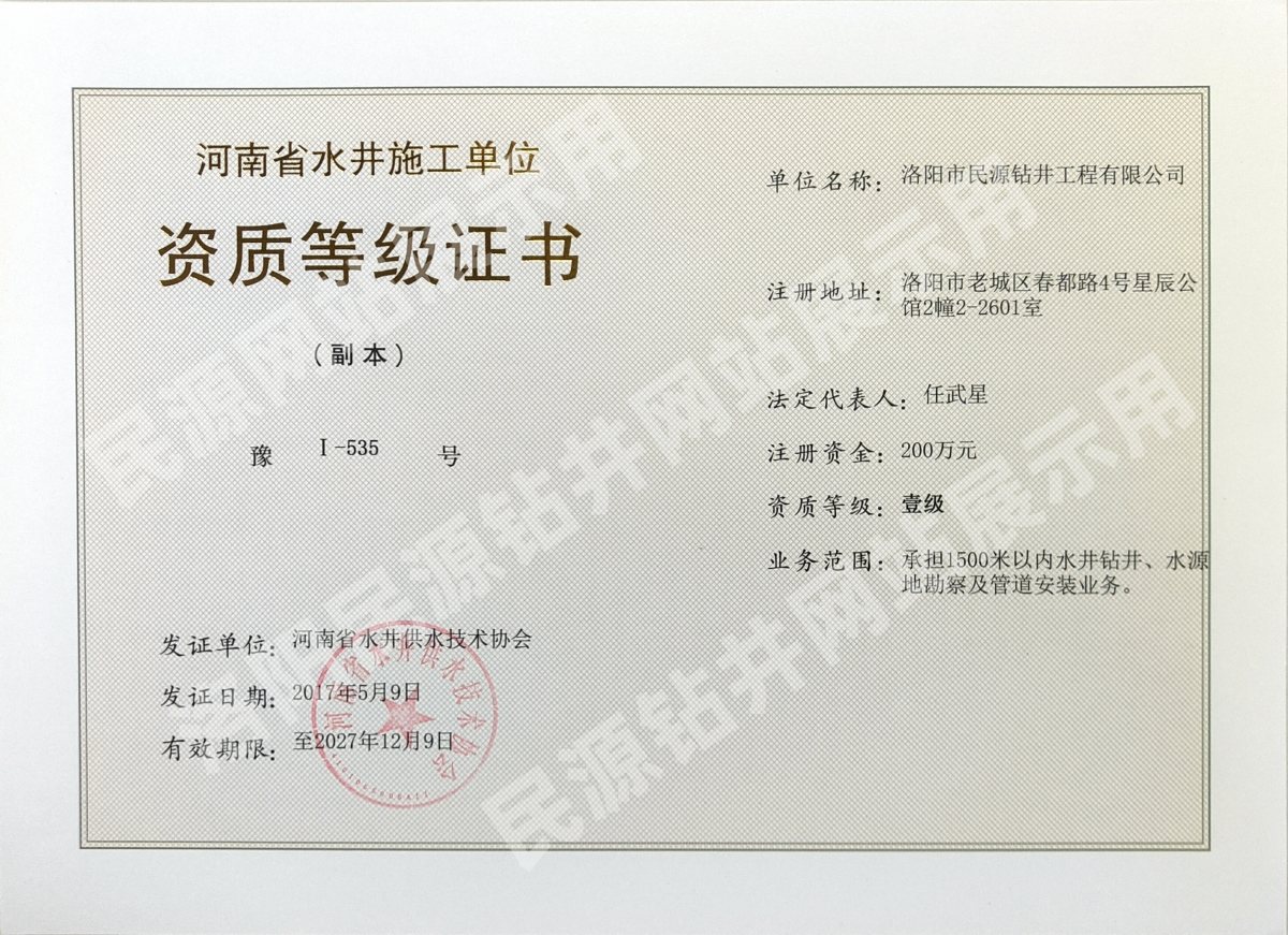 洛陽市民源鉆井工程有限公司是技術過硬、經驗豐富的施工團隊,具有鑿井行業壹級資質證書,擁有水鉆400、300鉆機、空壓機、打樁機、潛孔錘十余臺;適用于農家打井、農田打井、機關單位打井、企業廠家打井、以及各種工程工地打井。
